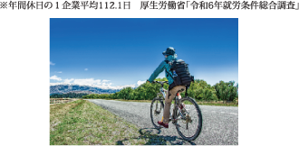 リフレッシュ、自己成長、子育て、介護など多様なライフプランに使用できるように年間休日128日と全国平均※を大幅に超える日数となっています。しっかり働き、休む環境が整っています。
